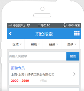 - 海量工作機(jī)會(huì)等著您,同一時(shí)刻您將面對(duì)數(shù)以十萬(wàn)的工作機(jī)會(huì);幫助您記憶最近搜索條件,簡(jiǎn)化您的搜索操作。